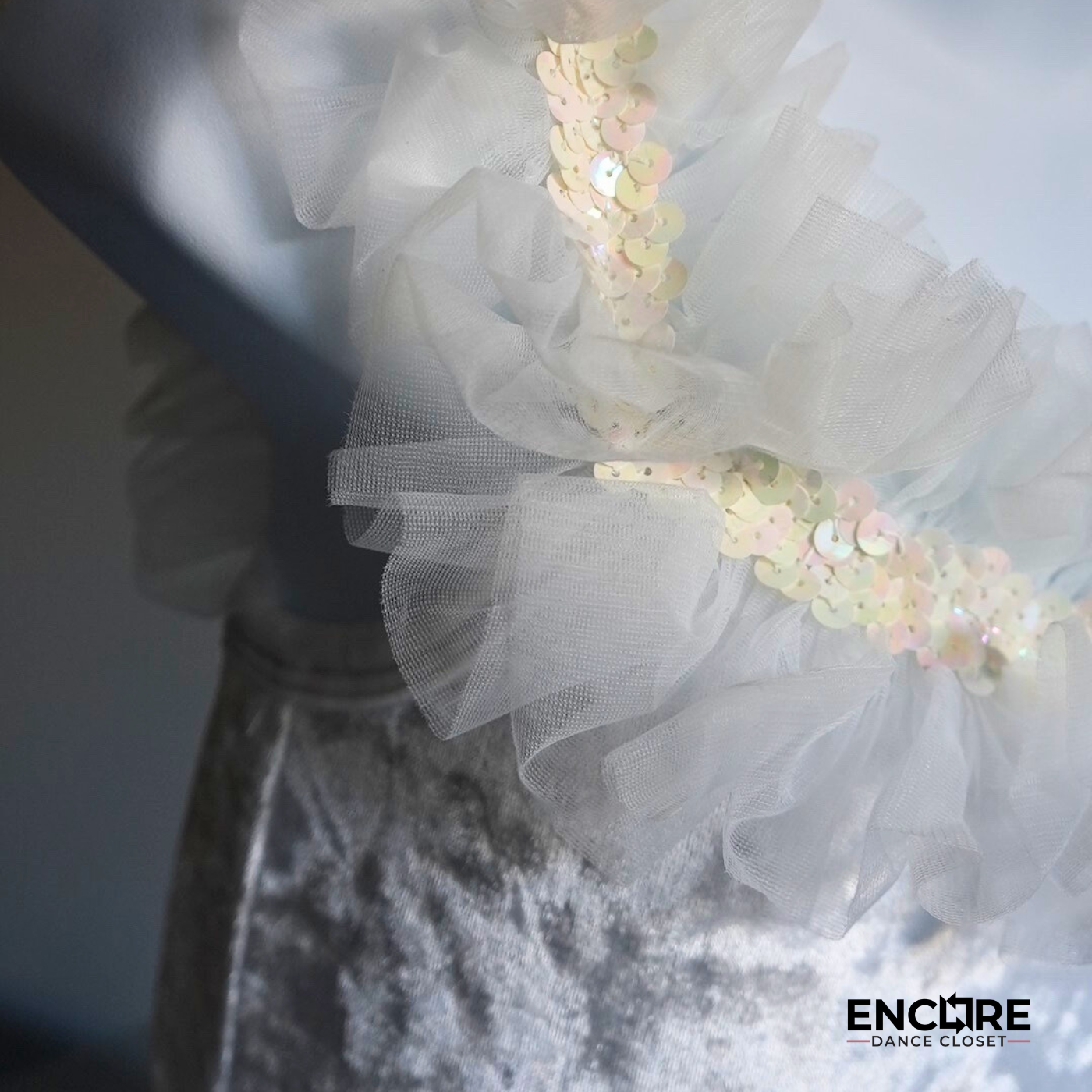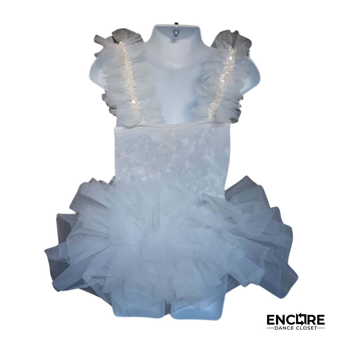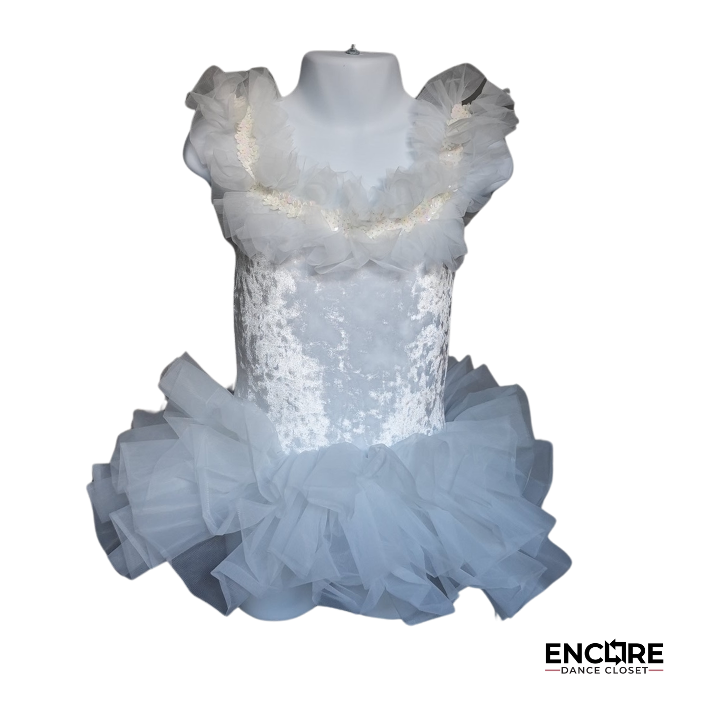 BRAND NEW! Adorable all-white crushed velvet leotard with a lined front bodice, featuring an attached organza tutu and ruffles adorned with sequin trim. The perfect blend of sweet and sparkly for a standout performance!