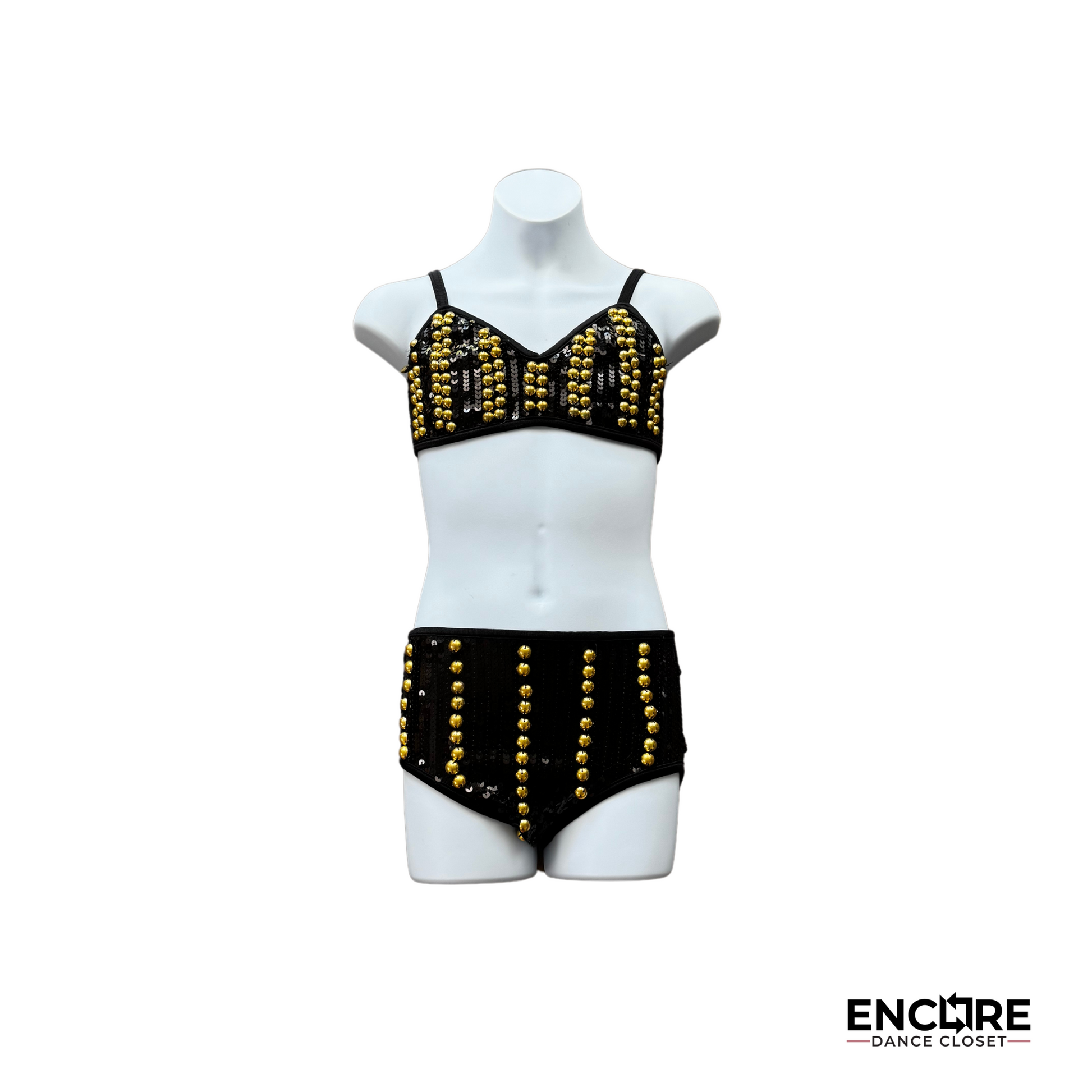 Catalog costume. This striking two-piece set features high-waisted briefs and a bra top adorned with sleek black sequins and bold gold studs. Simple yet eye-catching, this costume brings sophistication and sparkle to any jazz routine. In excellent condition.