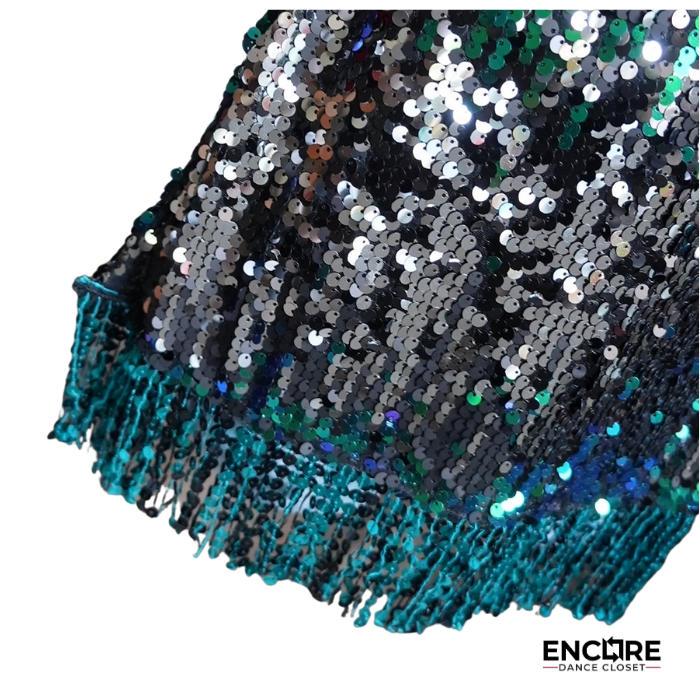 A dazzling blue, silver, and turquoise sequin dress with a flirty fringe skirt and a black leotard base. The top features black mesh detailing, paired with a dramatic tulle and applique headpiece. A showstopper for jazz or contemporary numbers.