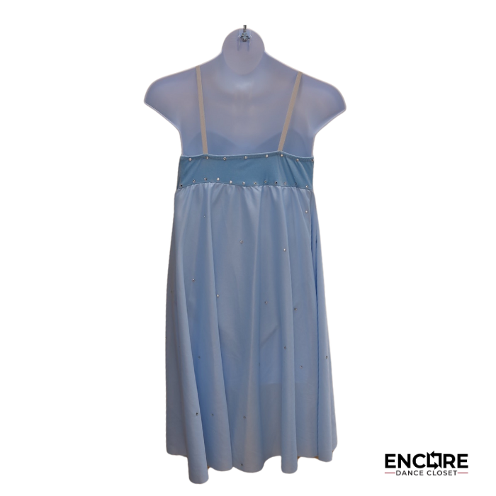 This enchanting baby doll-style dress is a vision in soft baby blue. The top is crafted from velvet, lending a gentle shimmer to every move, while the flowing mesh skirt adds a delicate, ethereal touch. A charming flower accents the center of the chest, with cascading mesh panels creating an eye-catching, graceful effect. Perfect for lyrical pieces, it captures the essence of elegance and innocence, making it a captivating choice for any young dancer.
