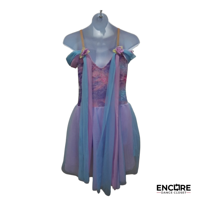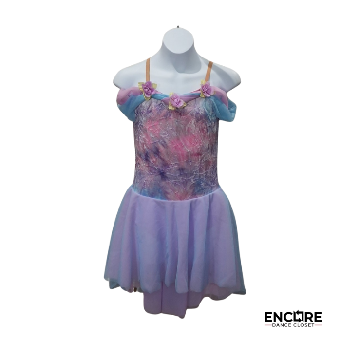 Soft crushed velvet bodice in dreamy multicolor tones paired with a mesh skirt in pinks and blues. Comes with a matching floral headpiece.