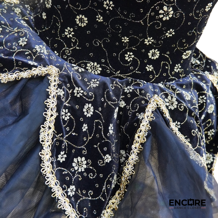 Black velvet ballet tutu dress with dazzling gold trims and a floral pattern. The deep V-back adds an extra touch of elegance, perfect for a regal moment under the lights!