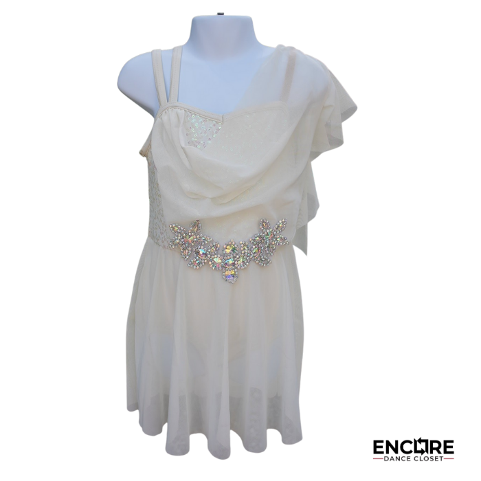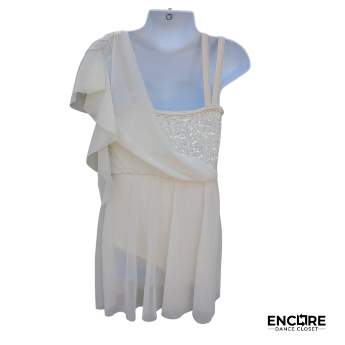 Shimmer under the spotlight in this enchanting dress, featuring an iridescent sequin spandex bodice with a cascading mesh sleeve and a single adjustable strap. The flowing power mesh drapes and skirt create graceful movement, while a rhinestone V-shaped appliqué at the waist adds a dazzling focal point. Attached briefs ensure comfort and coverage.