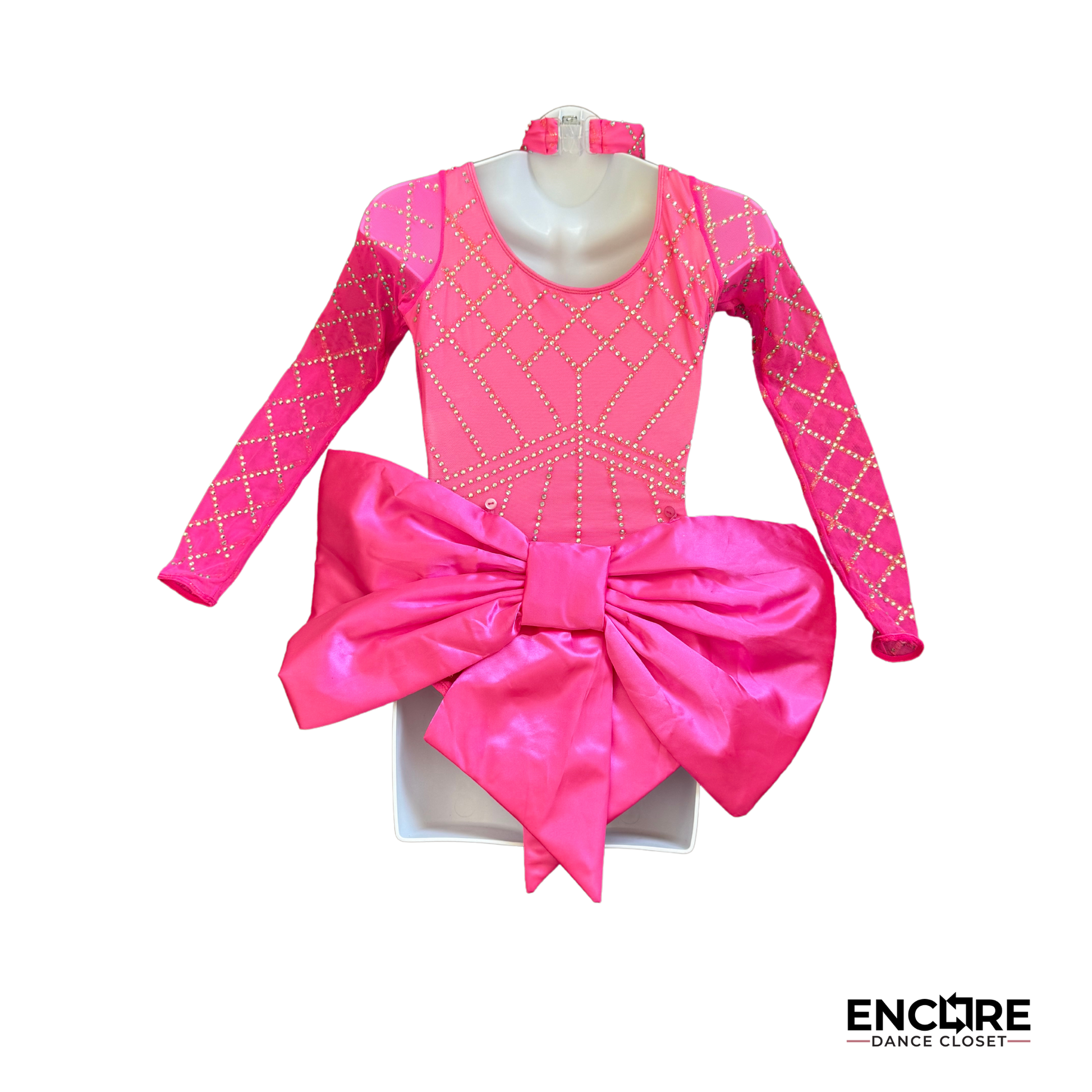 Make a statement in this hot pink long sleeve mesh leotard, adorned with intricate rhinestone patterns for added sparkle. The leotard features a dramatic, oversized satin bow on the back, which is easily removable for versatility. The all-mesh design adds an extra level of sophistication, making this a show-stopping piece perfect for the stage.