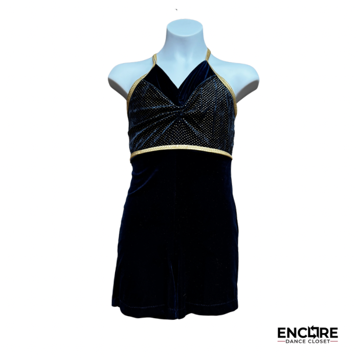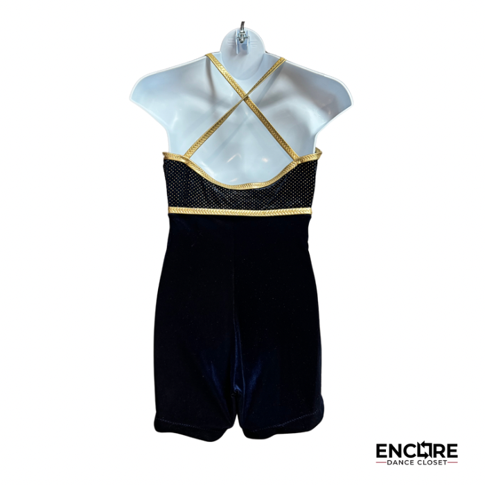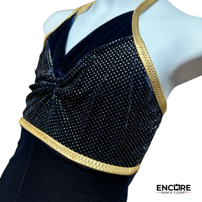 Shine bright in the Midnight Glow Biketard, crafted from luxurious navy blue velvet for a sleek and elegant look. The chest features a stunning gold-dotted velvet panel, adding a touch of glamour, while gold shoulder straps and a matching waistband provide a striking contrast. With its comfortable fit and chic design, this biketard is perfect for jazz, contemporary, or theatrical routines that call for sophistication and sparkle!
