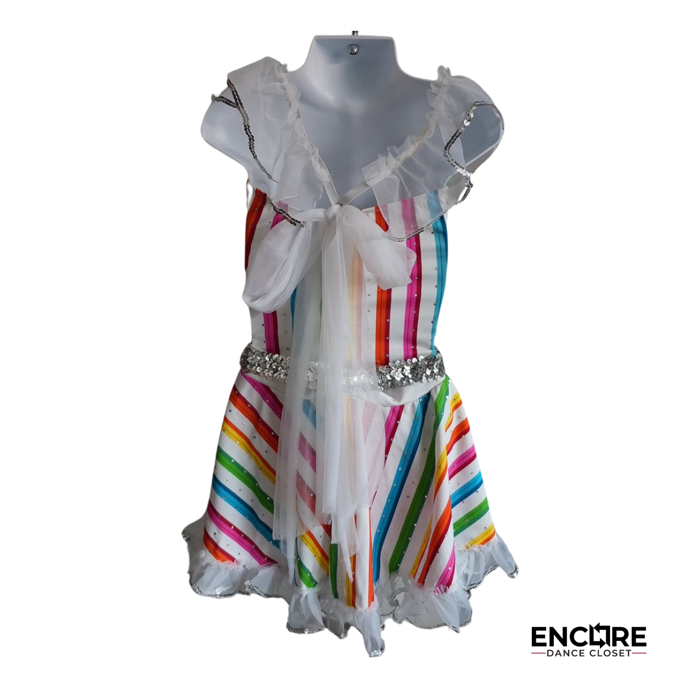 Matching leo and skirt in multicolor stripes with holographic silver dots. Silver sequin trim lines the waistband and tulle accents on the neckline and skirt, with a delicate tulle bow at the back for a fun, twinkling look.