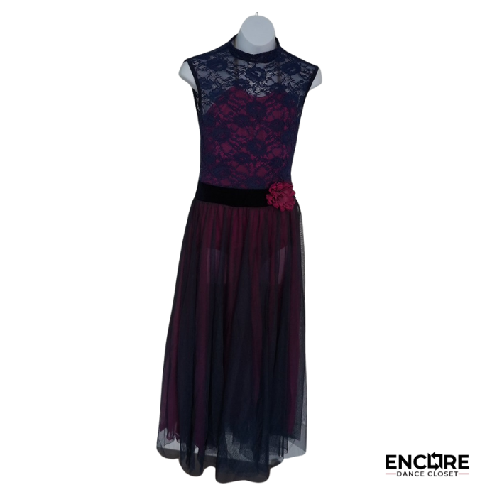 Elegant hot pink leo with dark blue lace overlay, velvet waistband, and a long-layered mesh skirt. Romantic, mature, and stage-ready.