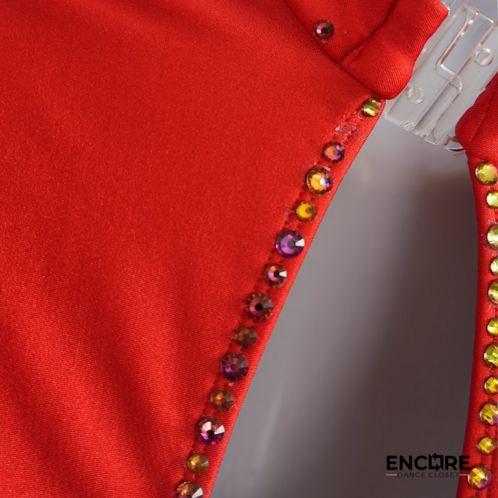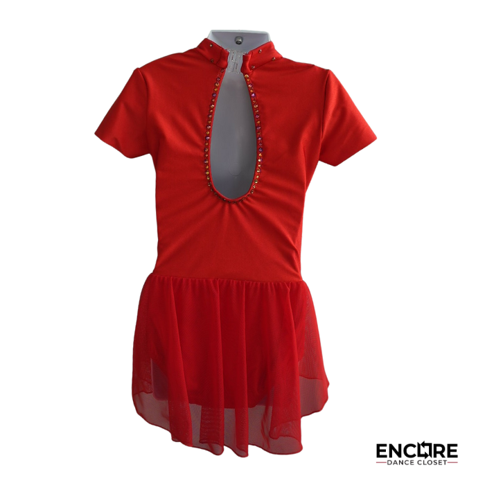 Rich red fabric with intricate floral appliqués makes this short-sleeved design a standout. Flattering lines and sparkling detail create a dramatic, elegant look for lyrical, contemporary, or themed performances.
