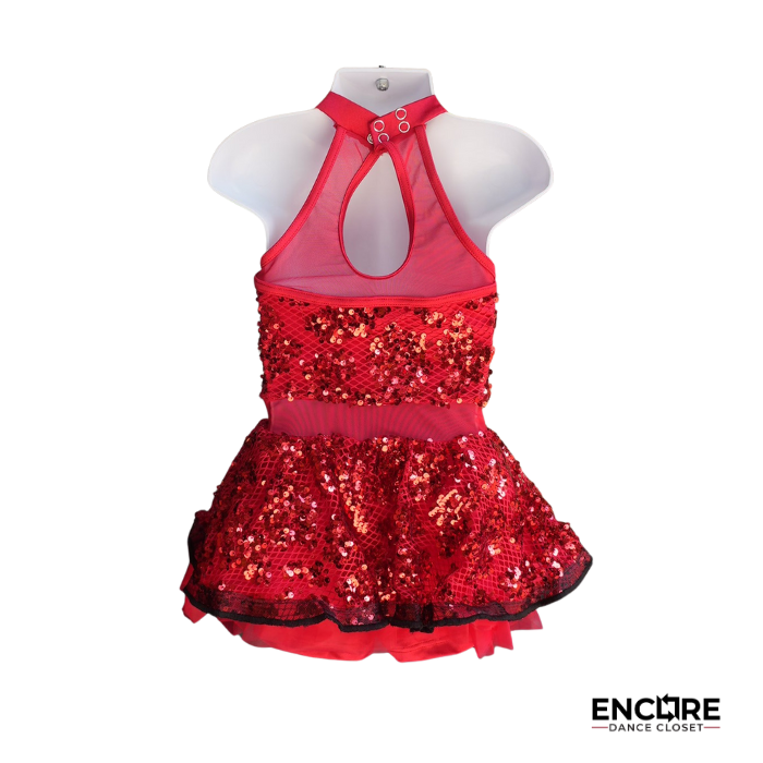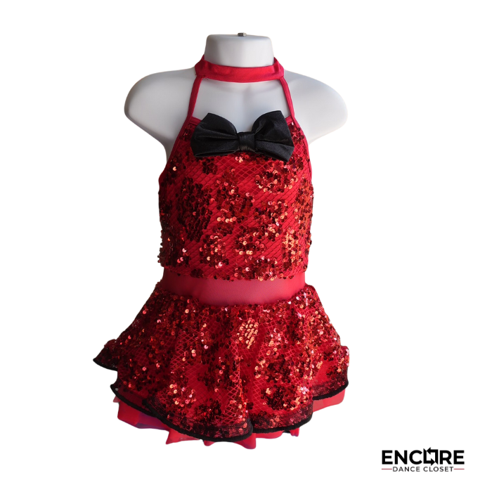 Polished and full of sparkle, this dress features a sequin fishnet bodice overlay, satin bow tie with snap closure, and a layered skirt with a tricot underskirt over attached briefs. Mesh waistline and back neckline insets add elegant detail. Comes with matching wrist cuffs and a large rhinestone barrette for a show-stopping finish.