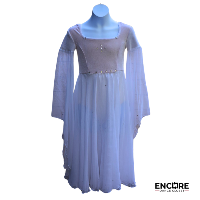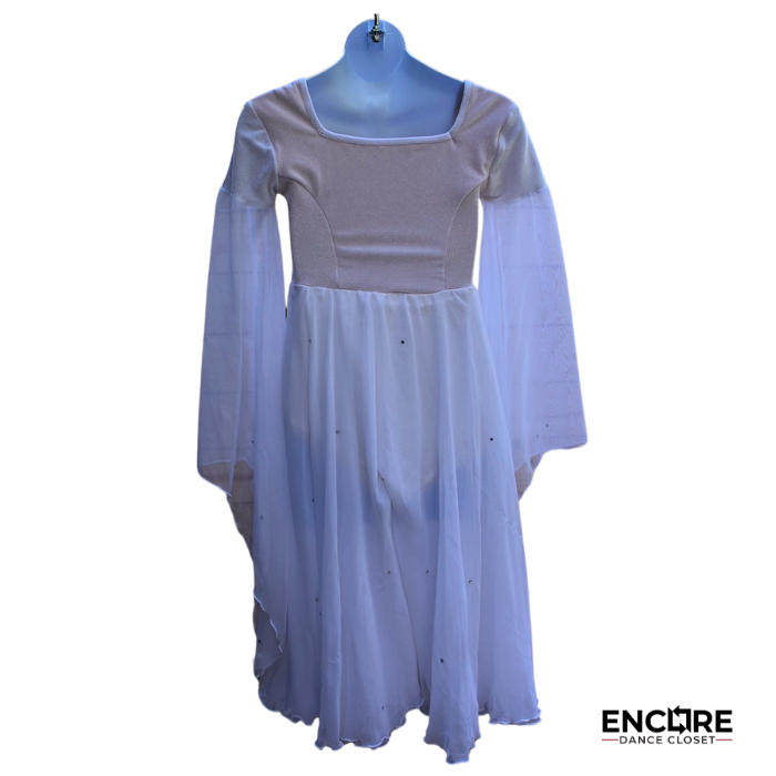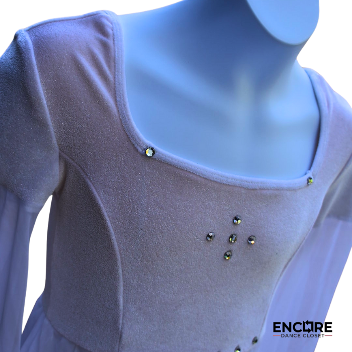 Exude grace and elegance in this White Velvet and Mesh Dress. The bodice is crafted from soft white velvet, adorned with delicate rhinestones on the chest for a touch of sparkle. Flowing mesh sleeves and an airy mesh skirt overlay add movement and drama, perfectly complementing the leotard base for a polished, stage-ready look. Ideal for lyrical, contemporary, or classical routines.